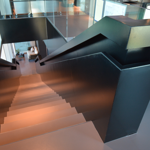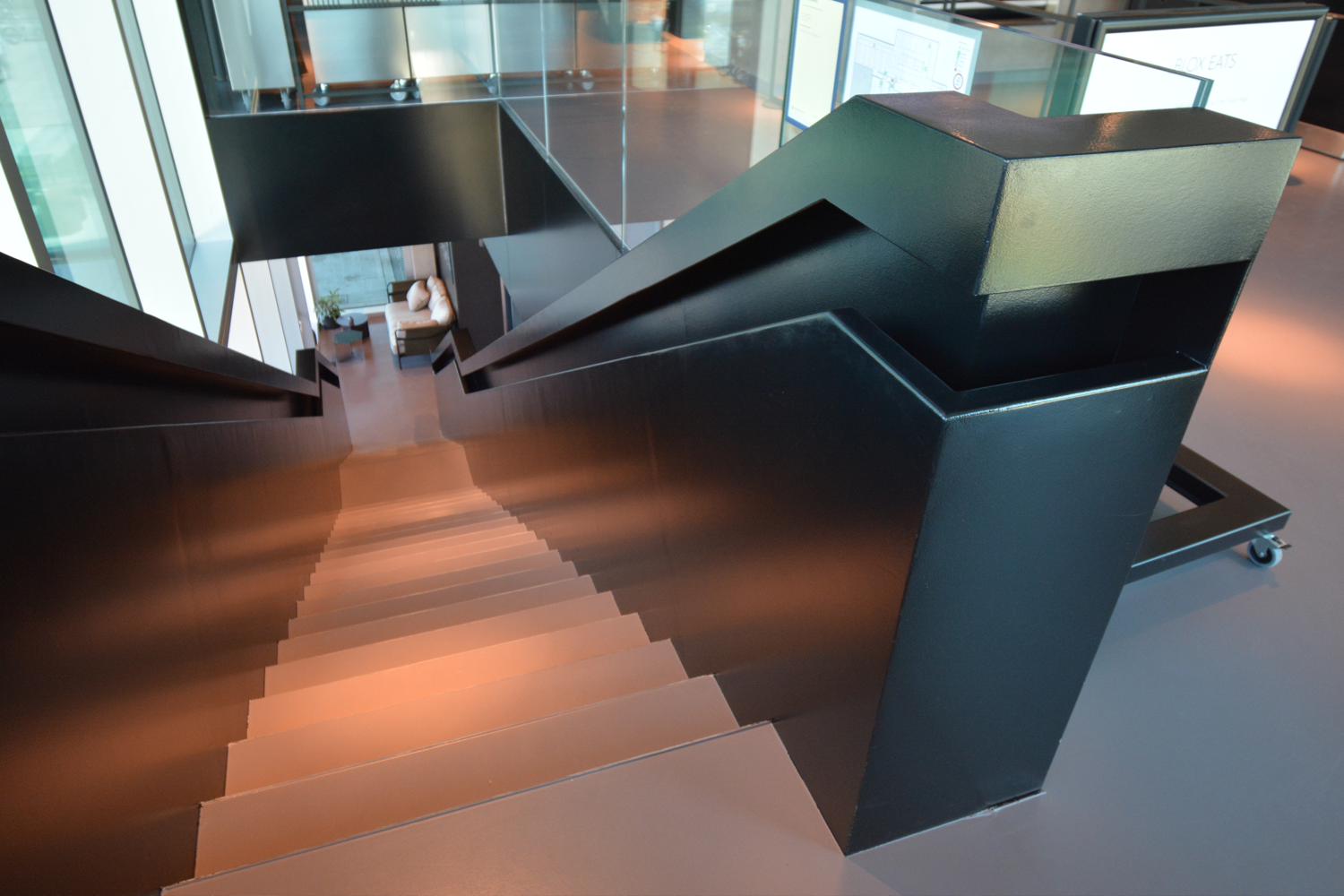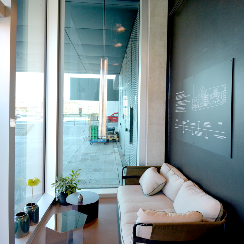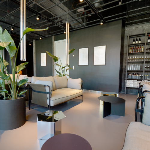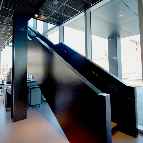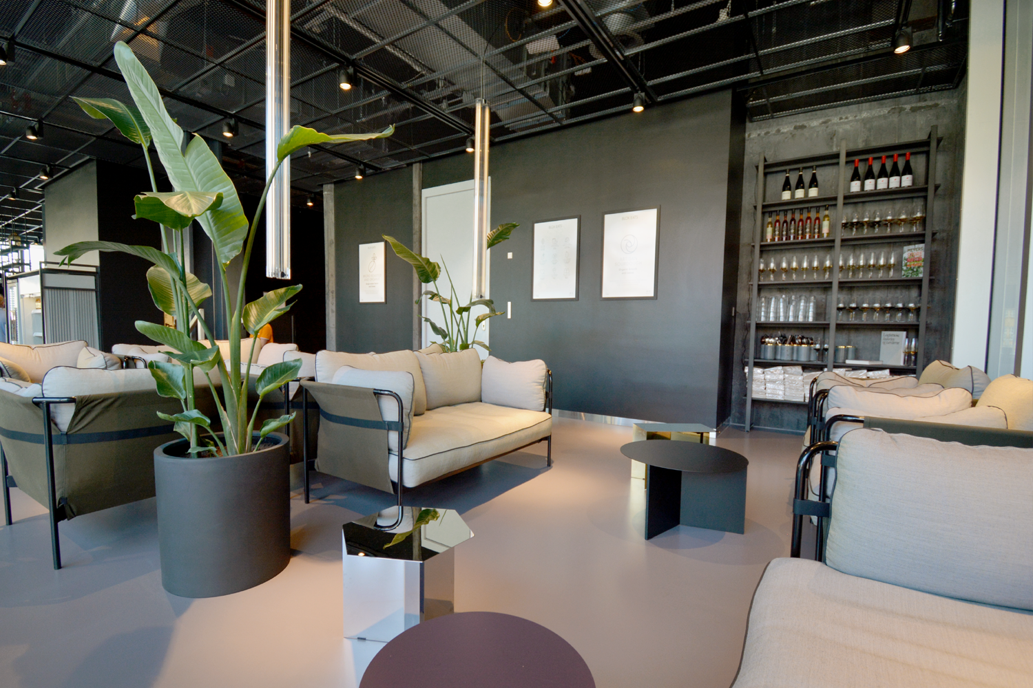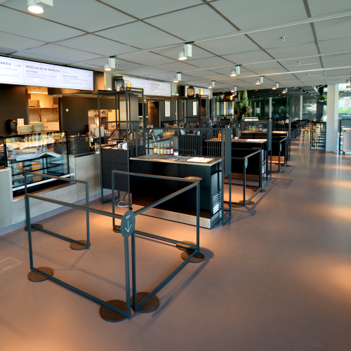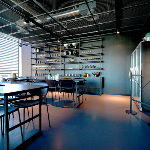 Øverste etage indeholder madstationer og de fleste siddepladser og underetagen serverer to-go mad og betjener udearealet. Her er også loungen placeret. Indretningen er holdt i mørke farver som er muligt grundet det store lysindfald fra glasfacaden. Loftet i stueetagen giver en virkning af ekstra loftshøjde da det består af riste med frit udsyn til alle installationer.