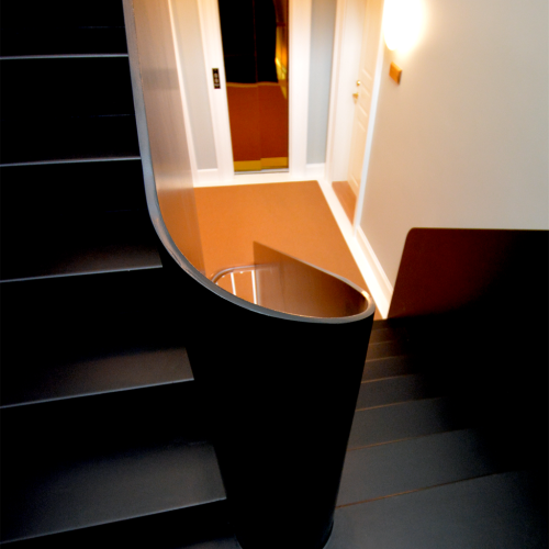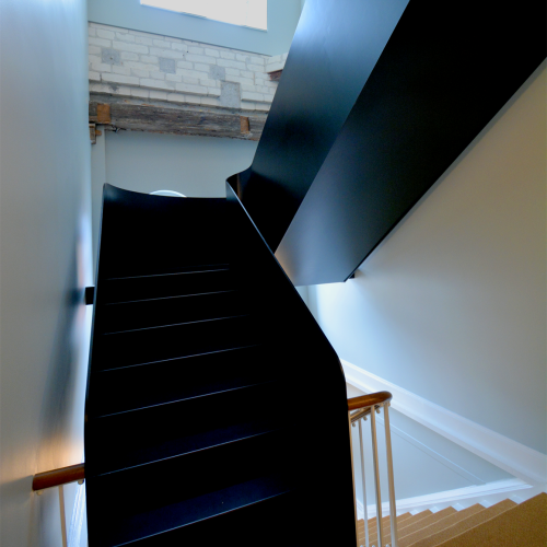 En ny trappe matchende de nye etageadskillelser blev præfabrikeret og kranet ned. Her var udfordringen at det ikke måtte gå ud over gågadens belægning. I opgangen valgte man at lade et stykke af den oprindelige konstruktion stå urørt som udsmykning. En ny seperat handicapvenlig elevator var nødvendig i stuen. Den oprindelige elevator og sidetrappe blev renoveret og der blev lavet tæppebrønd for at frigive oprindelige fliser til det øgede opgangsareal.