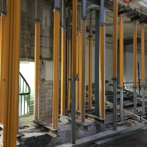 Det var et teknisk udfordrerne projekt som indeholdt nyt stueplan, og ikke mindst en nedbrydning af bankboksen i kælderen. Boksen bestod af 80 cm. tykke armerede og jernplade-forstærkede vægge, samtidig med at den understøttede de søjler der holdt bygningen oppe. Nye søjler måtte lempes ind gennem vinduerne. De gamle fjernes en for en og understøttes, alt imens en robot arbejdede med nedbrydningen i kælderen.